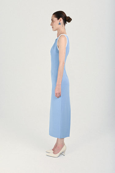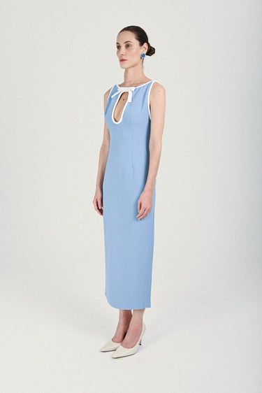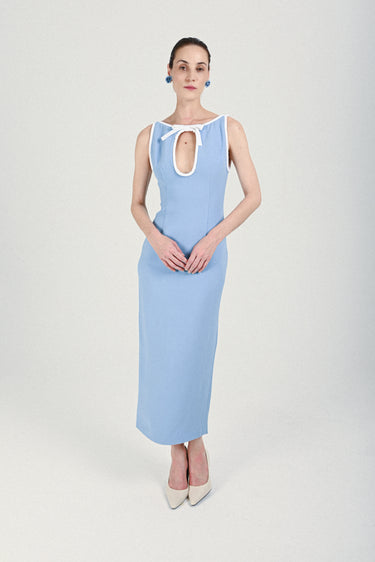 Crafted from structured sky blue sablé, this sleeveless midi dress features a signature oval cut-out at the chest, framed with contrasting white trim and tied with a delicate bow. The fabric’s subtle texture enhances the dress’s sculptural silhouette, hugging the body in all the right places. Finished with a clean mid-length hem, this piece blends retro elegance with a bold, modern twist.