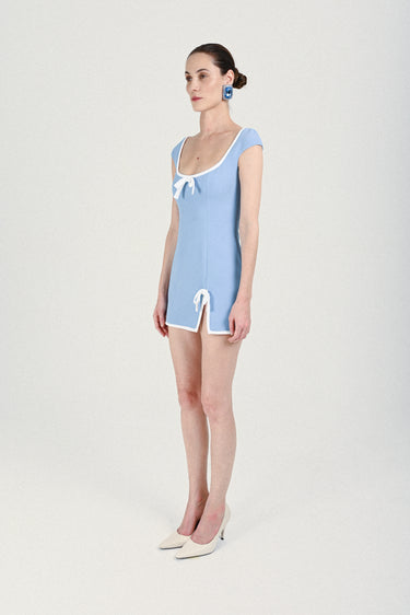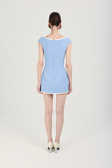Experience the iconic beauty of Rowen Rose with our mini dress featuring a stunning corseted effect. This form-fitting piece elegantly hugs the body, enhanced by delicate shoulder pads, a squared neckline, and a back zip closure.