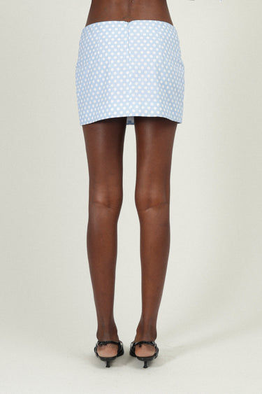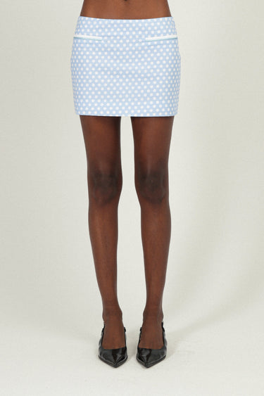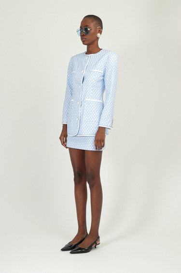 Part of a coordinated set, this blue mini skirt is crafted from luxury cotton gabardine, offering a structured yet comfortable fit. Featuring a playful polka dot print and contrast piping details, it blends vintage charm with modern elegance. Its tailored silhouette enhances the figure, making it a versatile piece that can be dressed up or down. Pair it with the matching jacket for a sophisticated statement look.
