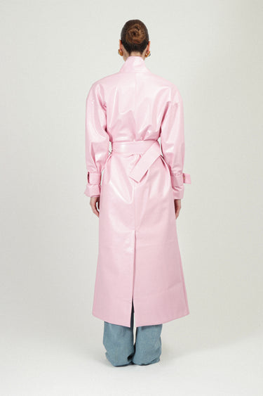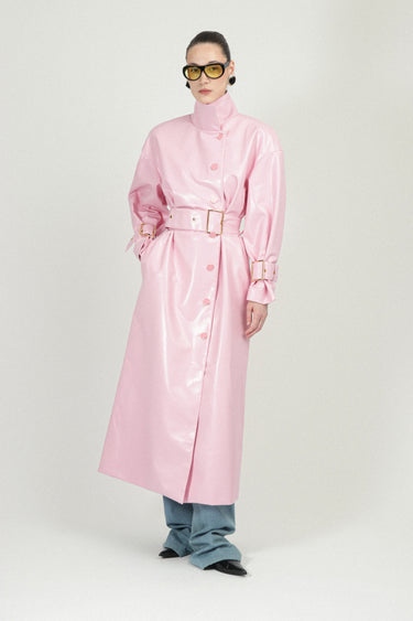 Make a statement with our luxurious pink trench coat, crafted from high-quality eco-leather for a sleek and sophisticated look. Designed with strong shoulders for a bold silhouette, this coat features adjustable buckles at the waist and cuffs, allowing for a perfect fit. Its timeless elegance and contemporary edge make it the ultimate wardrobe essential. Style it up or down for an effortlessly chic touch.