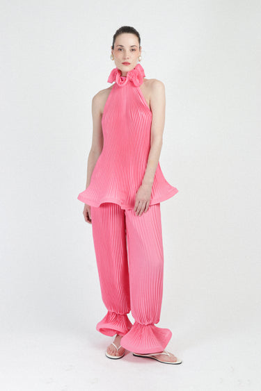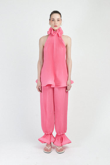 Complete the look with these stunning High-Waist Balloon Trousers, crafted from the same ethereal pleated georgette as the matching blouse. Designed with a flattering high-waist and a contemporary balloon silhouette, these trousers offer both comfort and avant-garde style. The hem is dramatically finished with a generous ruffle detail at the ankles, adding a playful yet sophisticated flourish to every step. These trousers are a statement piece that brings texture and movement to your ensemble.