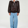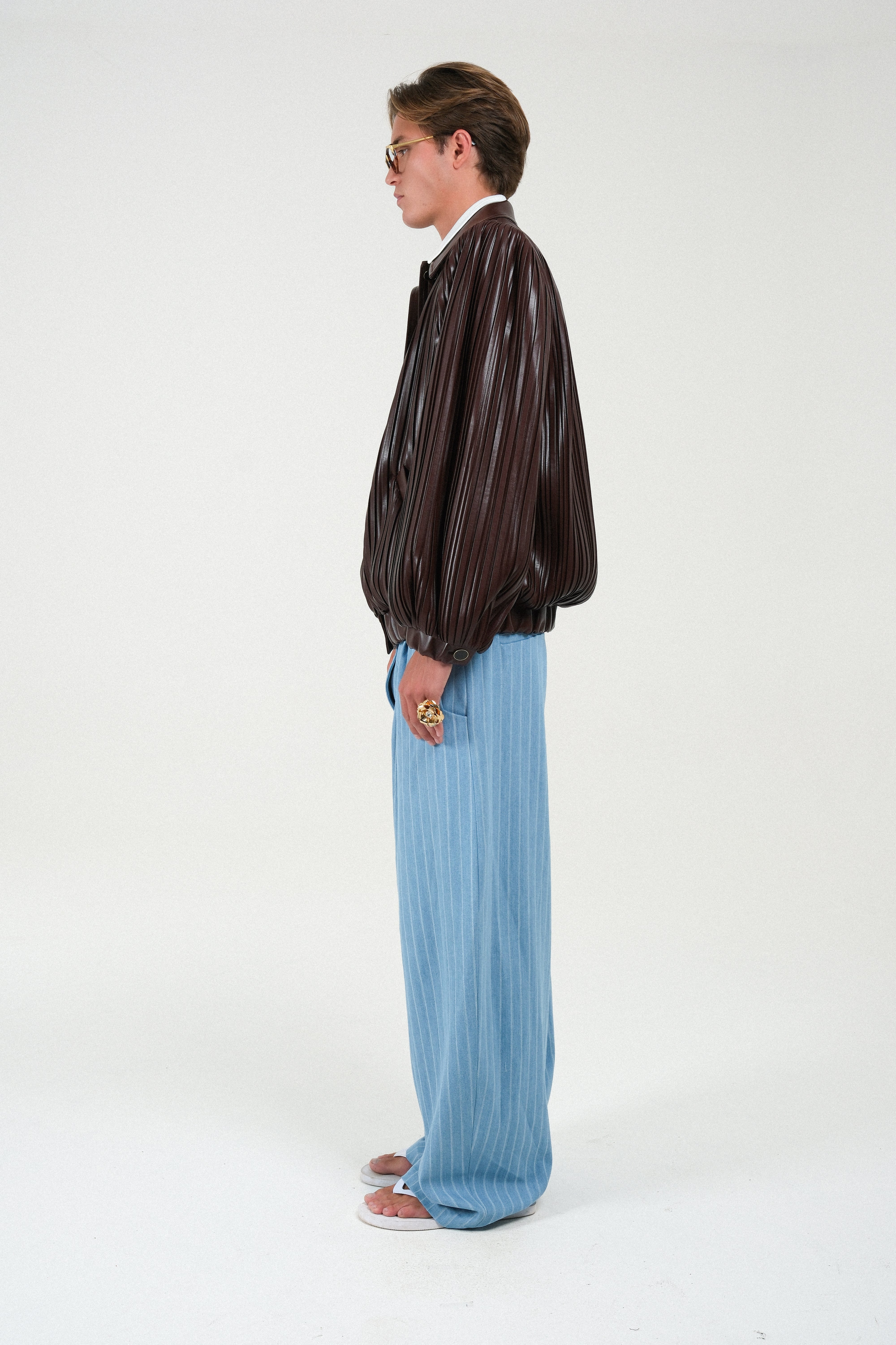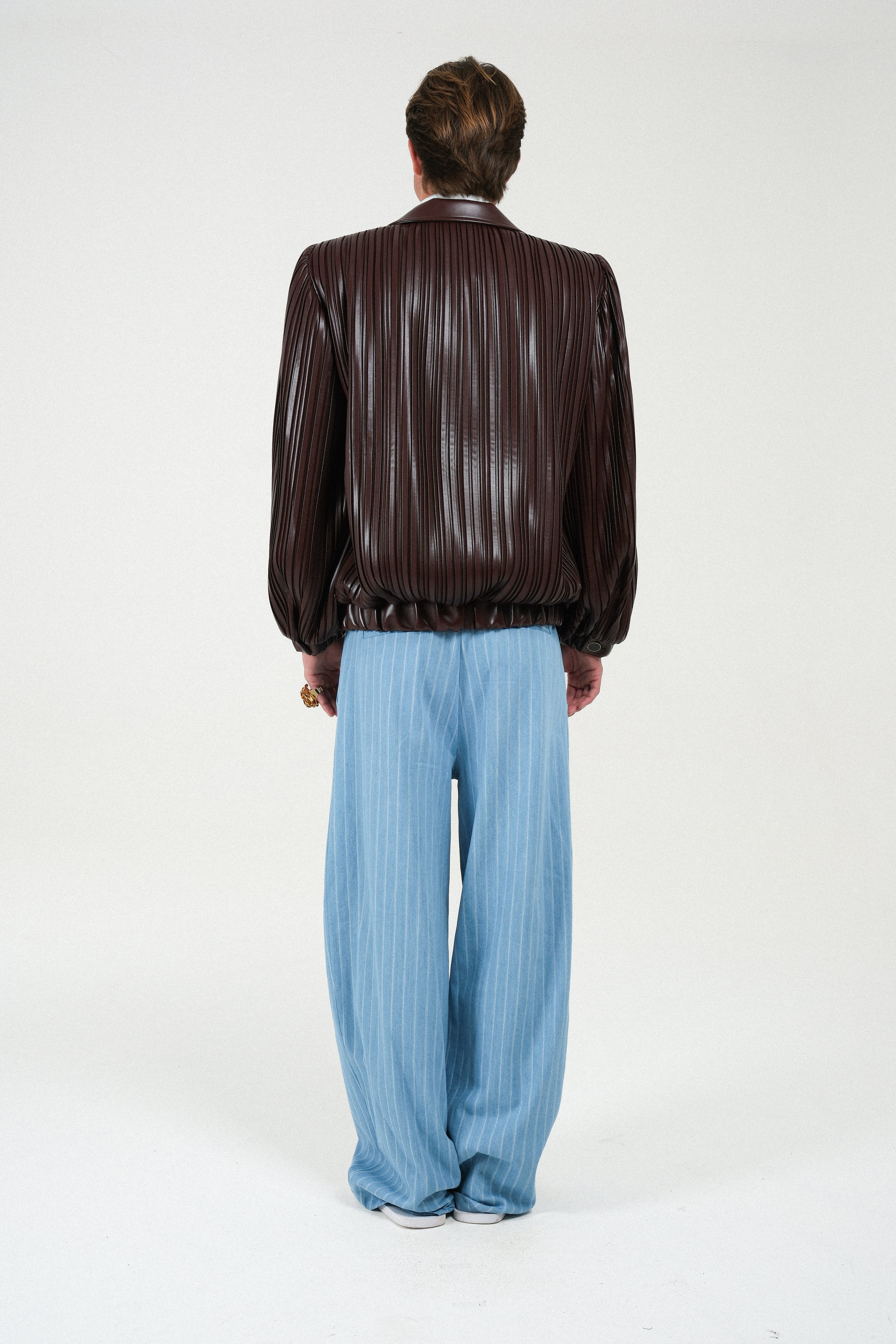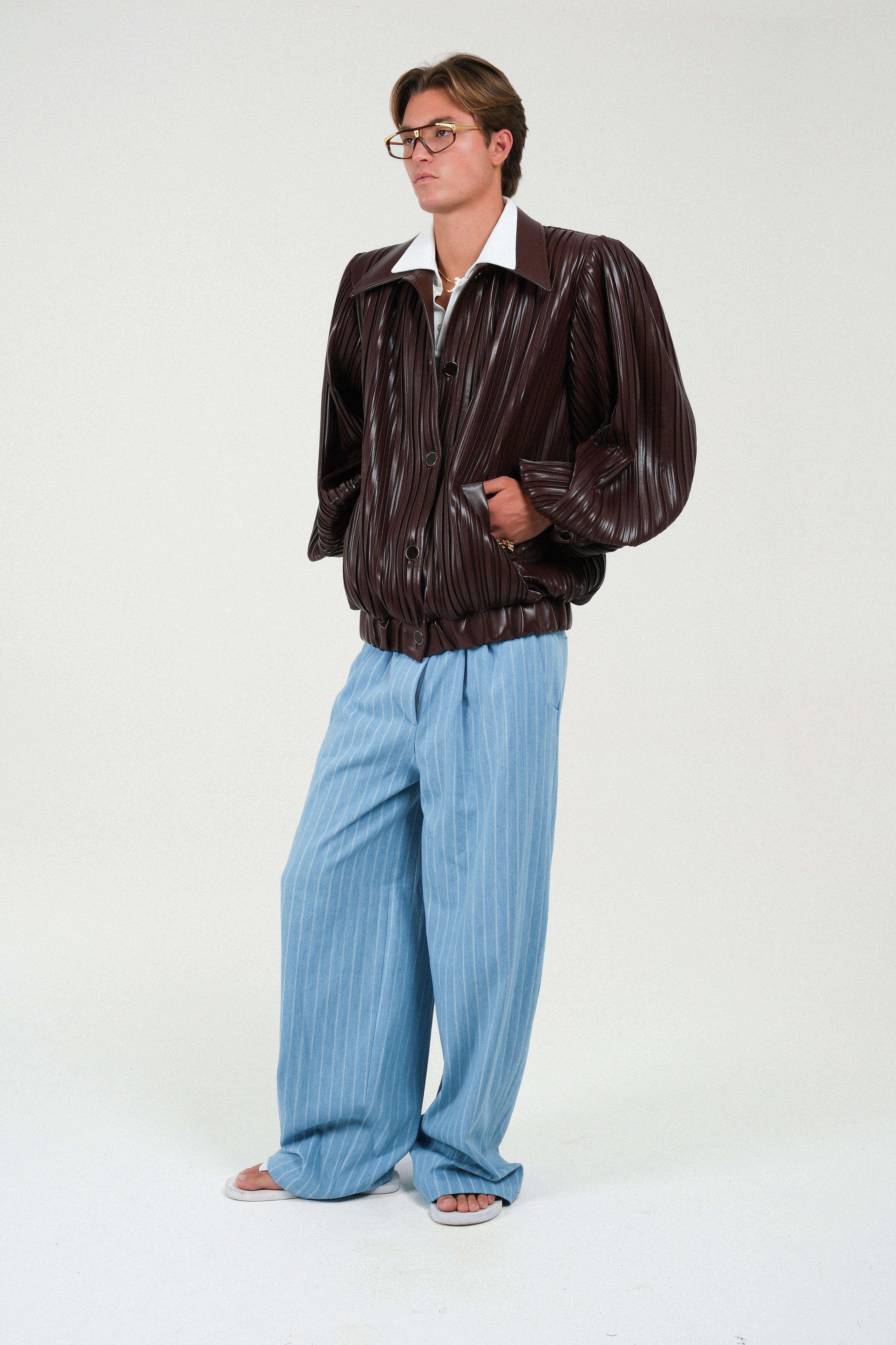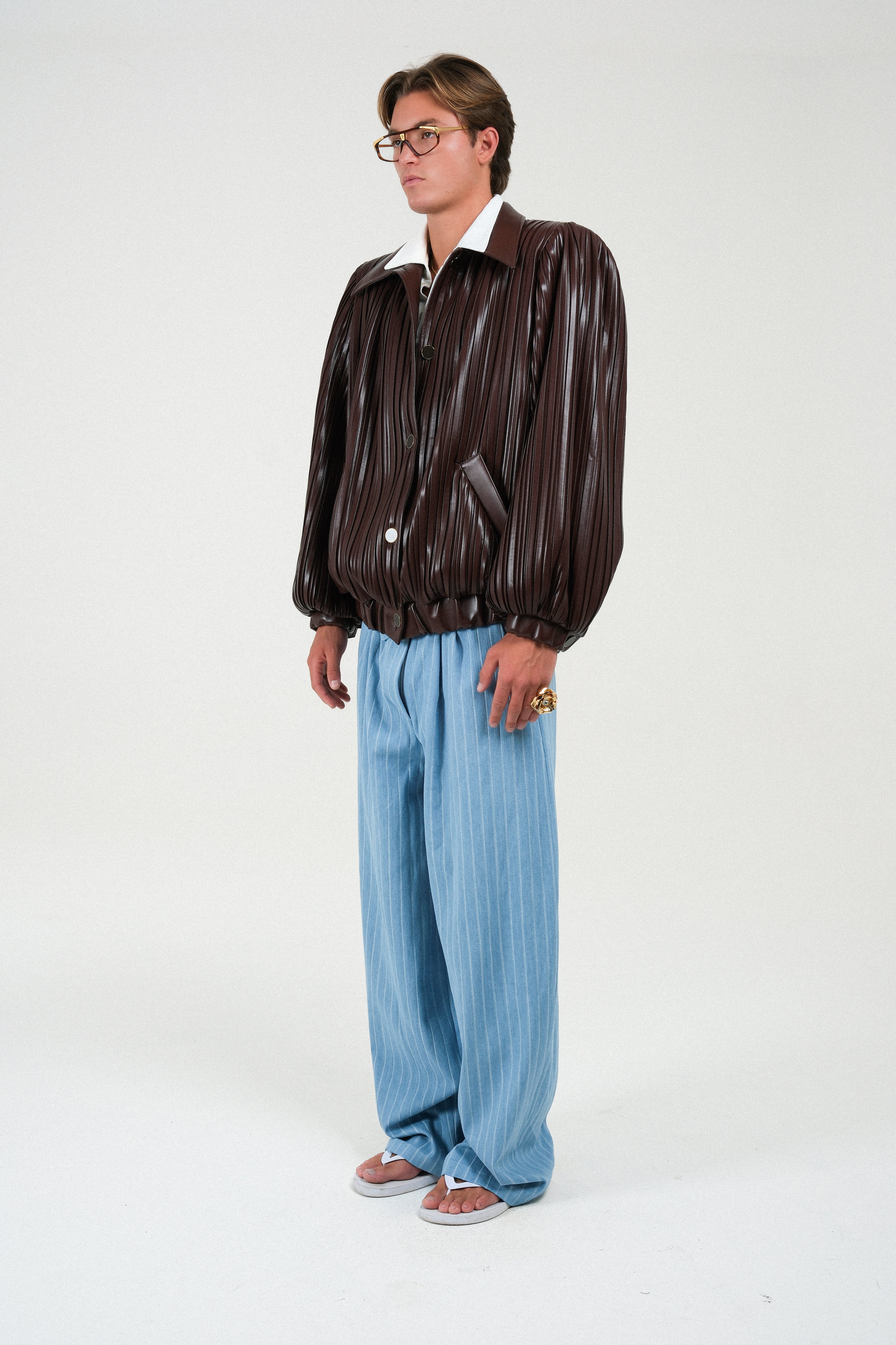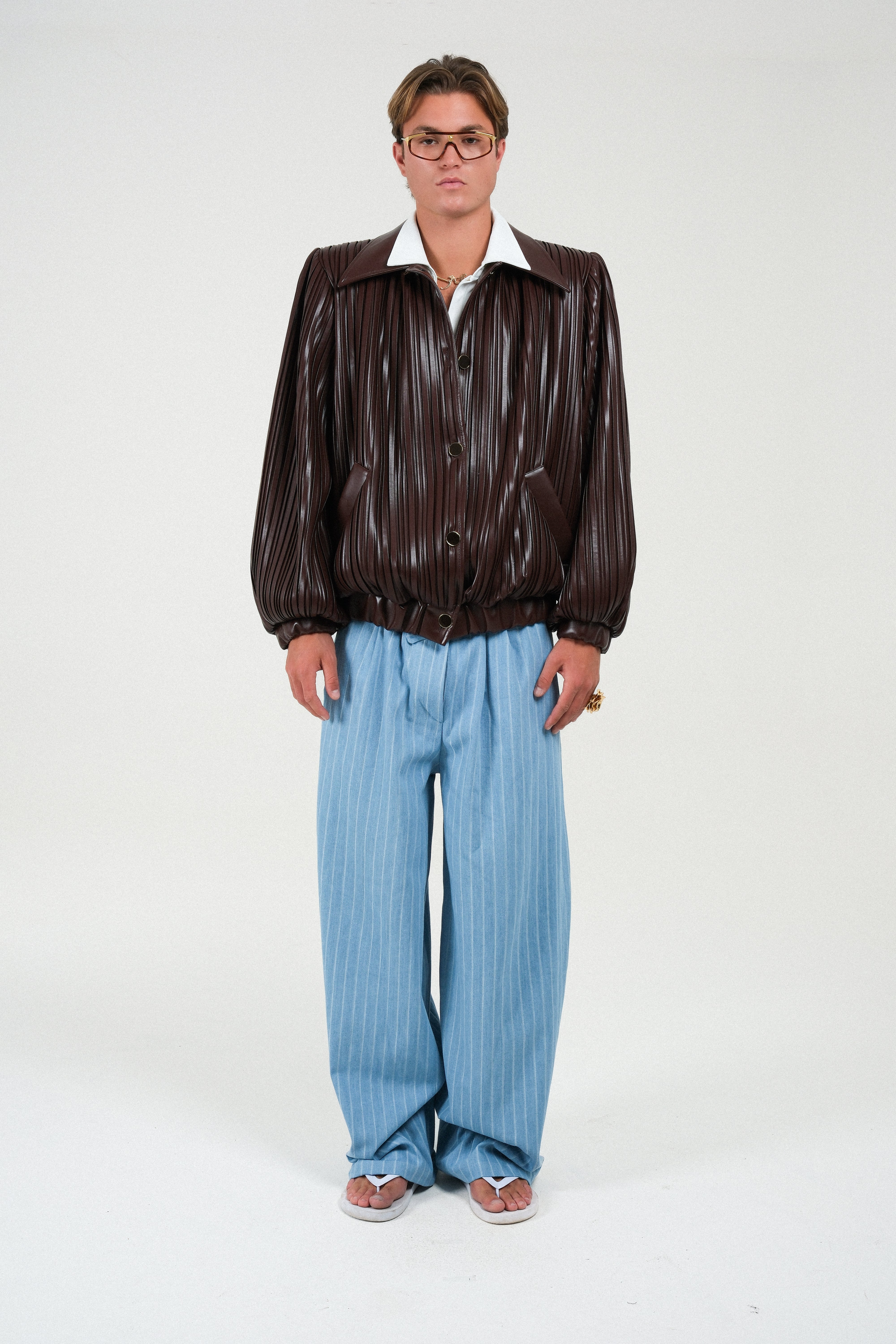 Make a bold statement with this unique bomber jacket, masterfully crafted from pleated eco-leather. The striking texture of the permanent pleats adds dynamic movement and a luxurious depth to the dark brown hue. This piece elevates the classic bomber silhouette with a refined polo collar and features signature buttons that provide a distinctive, high-end finish. Designed for the modern wardrobe, this jacket is an effortless way to introduce texture and contemporary edge to any outfit.