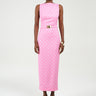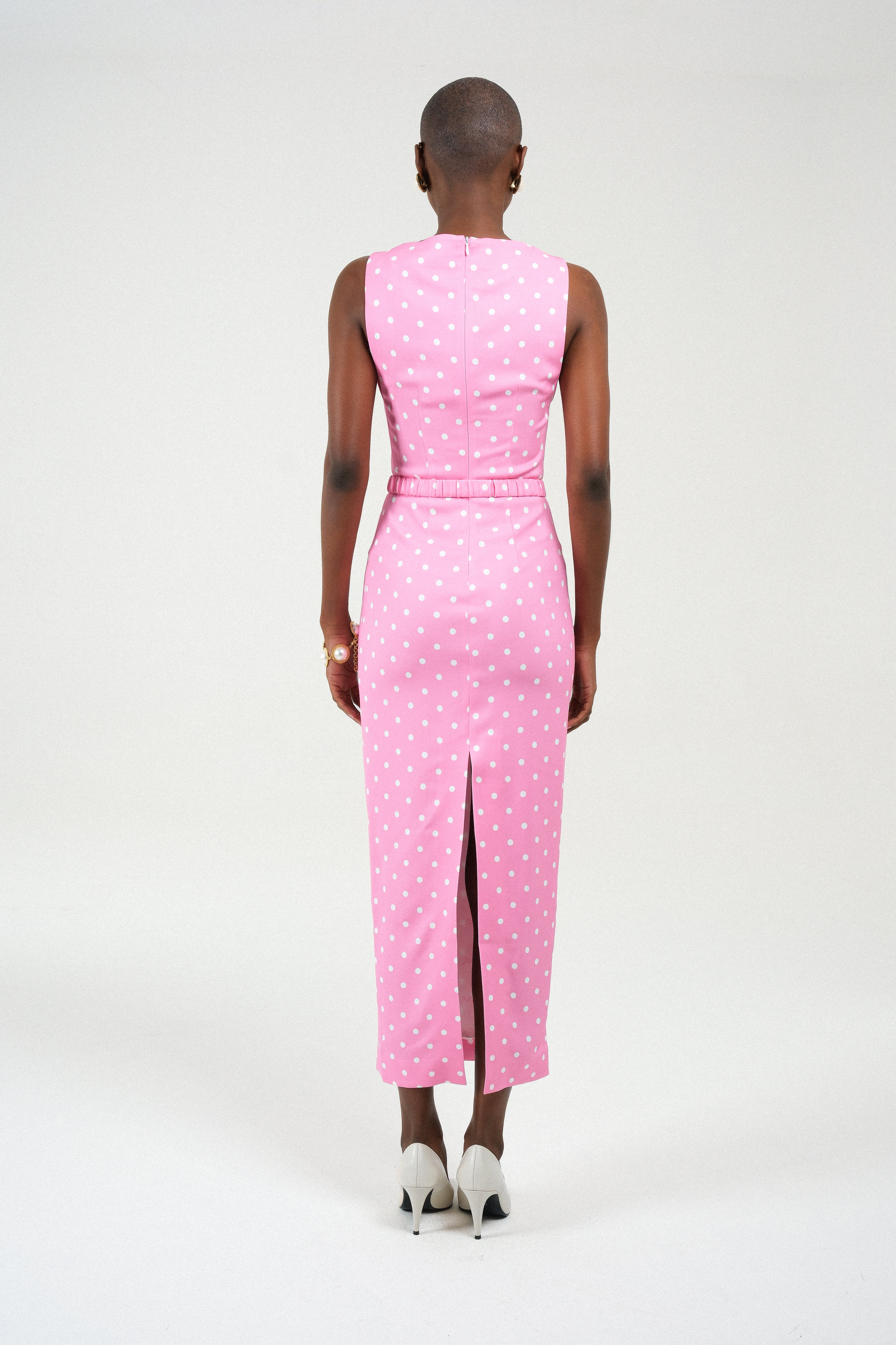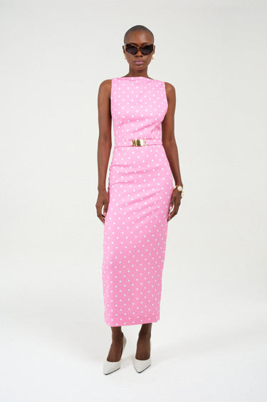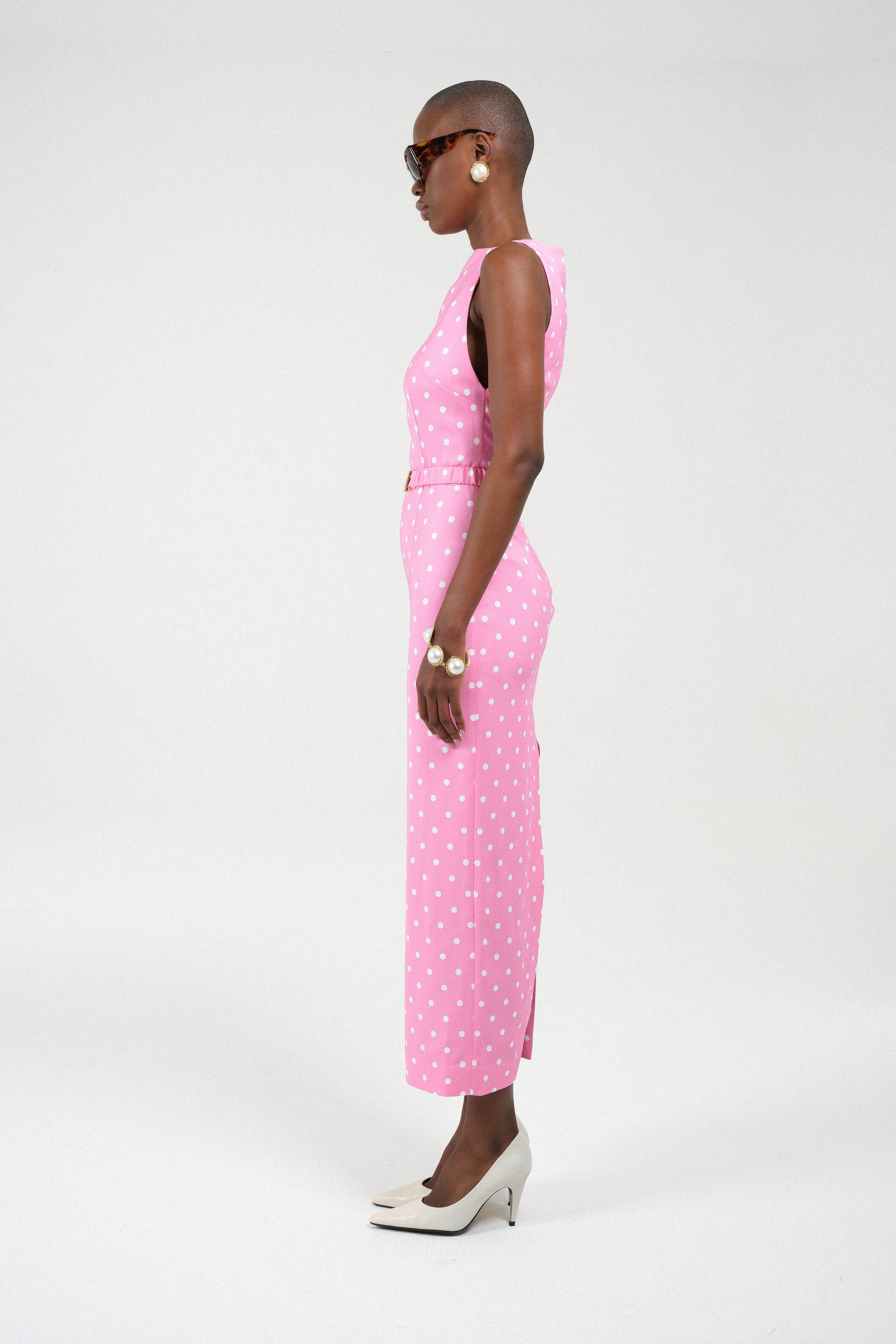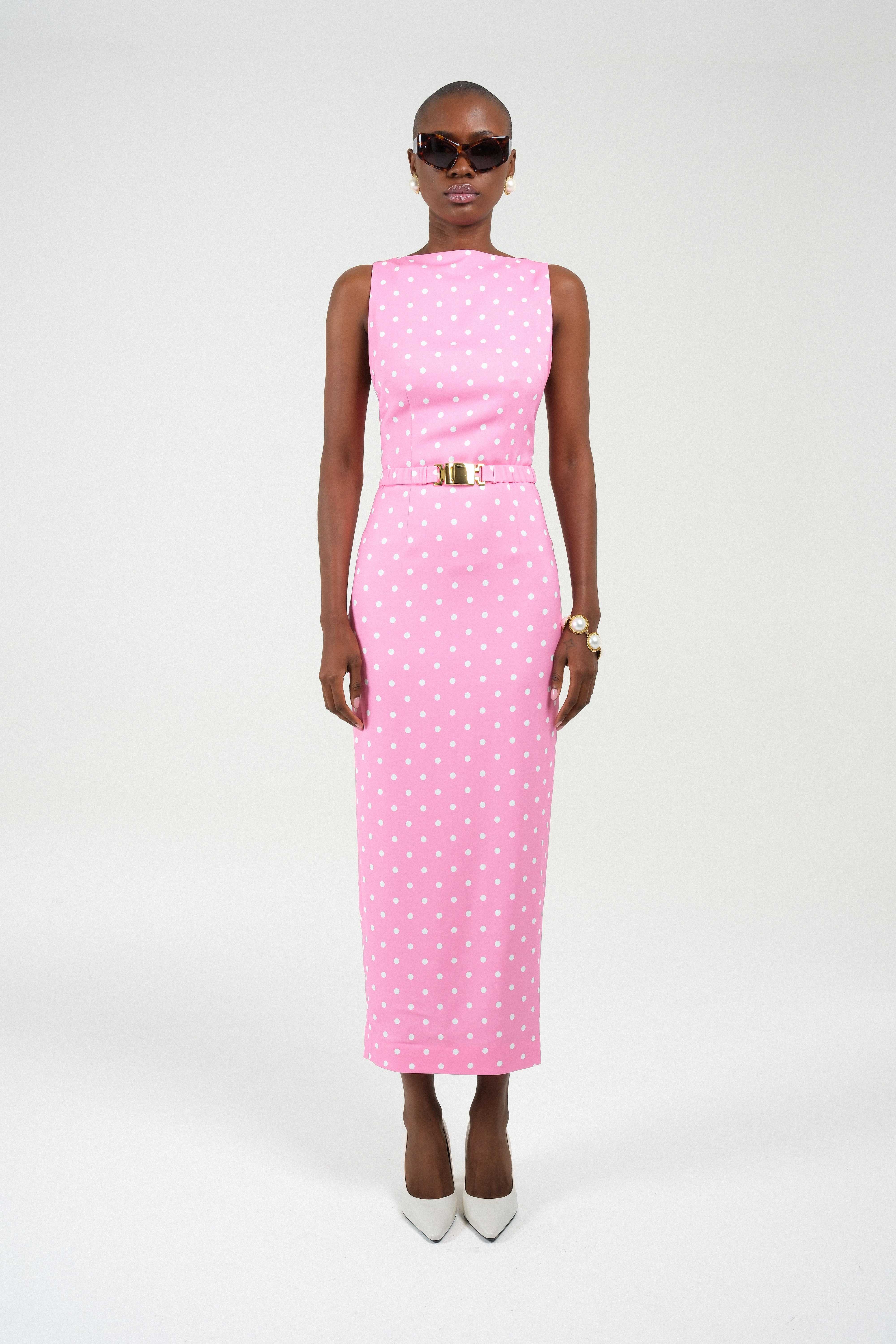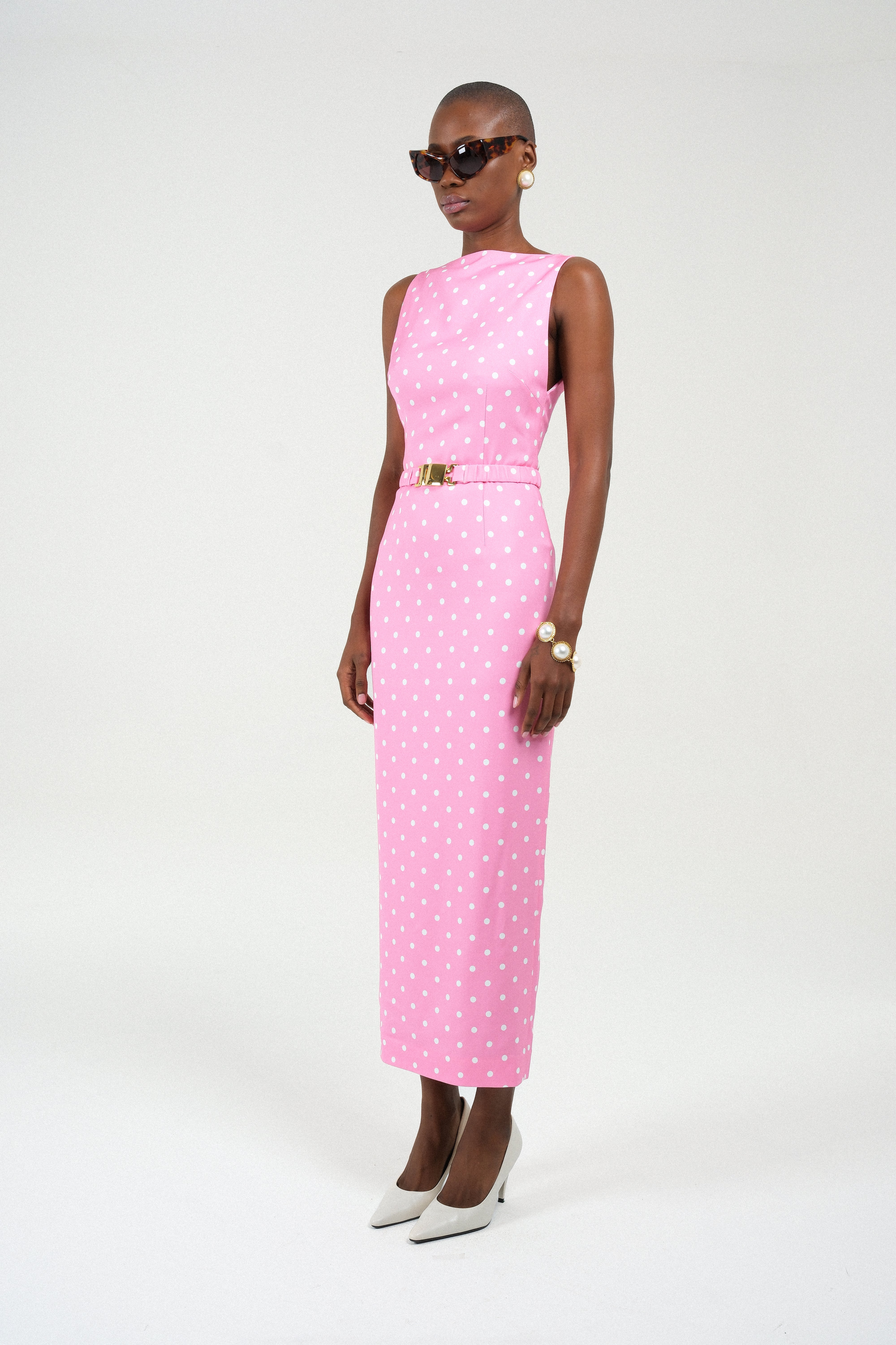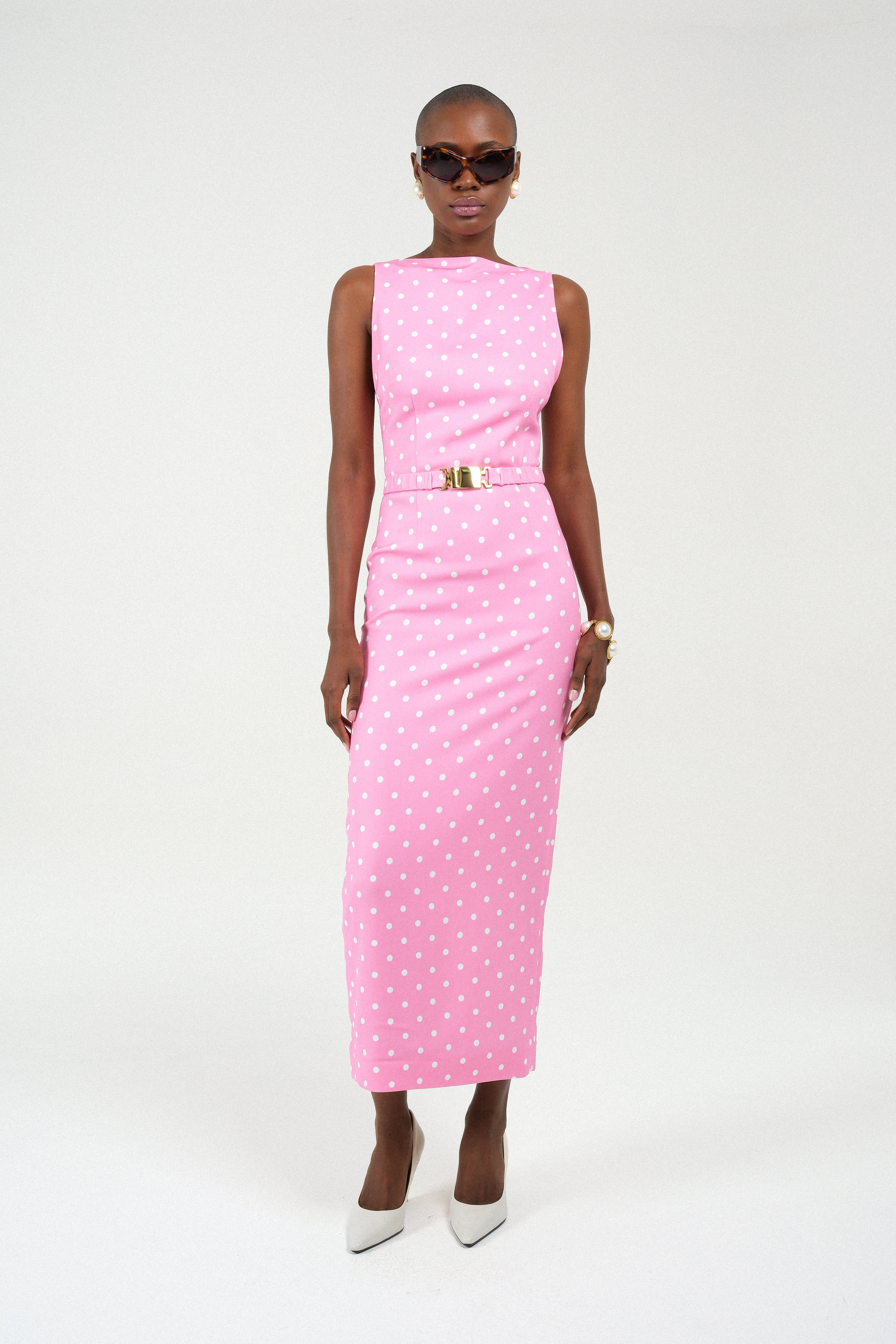 Sable long dress crafted from a refined, structured fabric that enhances its sculptural silhouette. It features a straight neckline and a fitted waist accentuated by a matching belt with a gold-tone buckle, creating an elongated and elegant line. The playful polka dots print adds timeless allure, while the minimalist cut highlights impeccable tailoring. A statement piece that merges classic elegance with modern precision—perfect for elevated evening occasions.