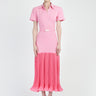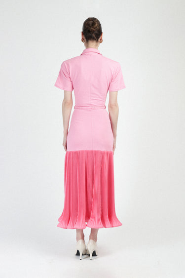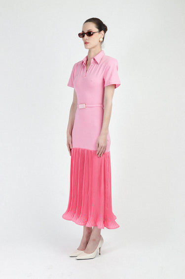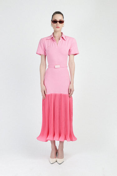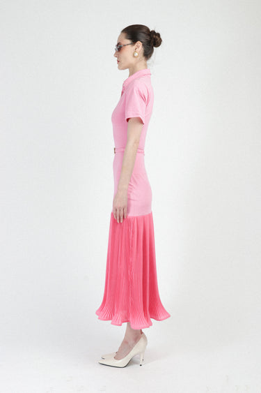 This unique piece seamlessly merges two distinct fabrics for a look that is both modern and timeless. The fitted top, made from high-quality cotton jersey, provides ultimate comfort, while the airy, pleated georgette skirt creates beautiful movement. A matching belt with a lacquered plate elegantly defines the waist, and a crinoline-trimmed hem adds a touch of couture-inspired volume. Effortlessly transition from day to night with this versatile and sophisticated wardrobe essential.