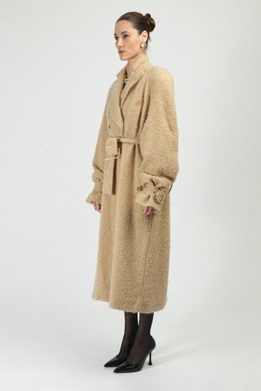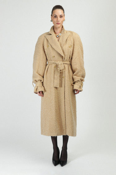 Introducing our iconic Raglan Puffy Coat in warm beige tweed. With its luxurious feel and versatile design, this coat is the ultimate wardrobe essential for any occasion. Featuring an oversized fit, double breasted closure, raglan sleeves, and round shoulder pads, it exudes strength and elegance. Customize your look with adjustable belts on the waist and sleeves, and stay warm on chilly days with its quilted interior and convenient side pockets.