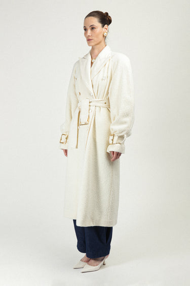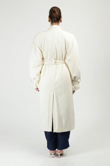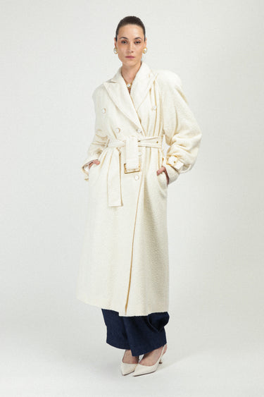 Introducing our iconic Raglan Puffy Coat in warm white tweed. With its luxurious feel and versatile design, this coat is the ultimate wardrobe essential for any occasion. Featuring an oversized fit, double breasted closure, raglan sleeves, and round shoulder pads, it exudes strength and elegance. Customize your look with adjustable belts on the waist and sleeves, and stay warm on chilly days with its quilted interior and convenient side pockets.