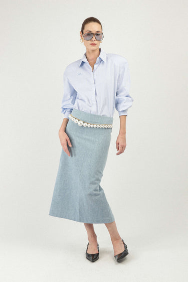 Elevate your wardrobe with our luxurious oversized shirt, showcasing this season's white and blue stripe pattern in crisp poplin. The raglan style is enhanced with shoulder pads and a tasteful embroidered logo. Complete the look with the matching skirt for a chic and sophisticated ensemble.